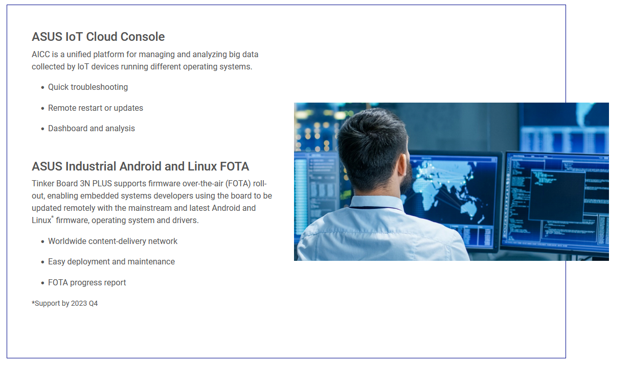 With its versatile and modern 64-bit, quad-core ARM-based processor — the Rockchip RK3568 — ASUS IoT Tinker Board 3N PLUS offers superior performance in NUC size. Powered by an ARM-based Mali™-G52 GPU, Tinker Board 3N PLUS offers smoother graphics processing and better data security, allowing for a wide range of applications in smart manufacturing and smart retail such as IoT gateways, human-machine interfacing (HMI), digital signage, self-service kiosk and more.